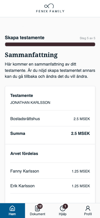 Fenix Family är en digital tjänst där du enkelt skapar juridiskt bindande avtal så som testamenten, samboavtal, framtidsfullmakter och mycket mer. Genom att svara på frågor om din livssituation tar du fram skräddarsydda avtal – digitalt, säkert och juridiskt granskat.